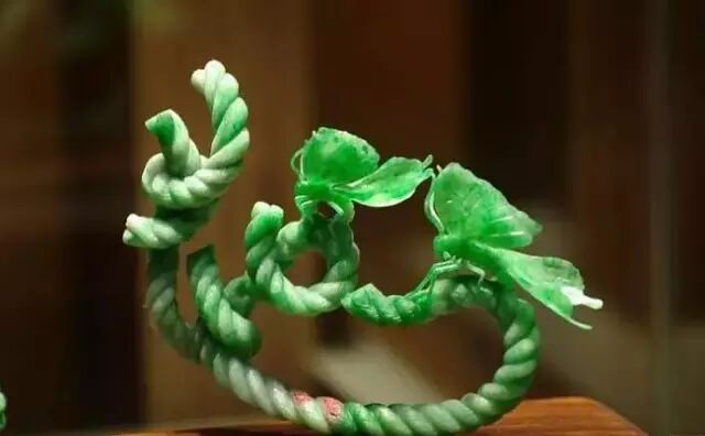 一共是两件作品,坚硬的翡翠化成为柔韧的麻绳交缠在一起,一共五只翠绿的蝴蝶翩然在绳结之上,呈现了几近透明的感觉。