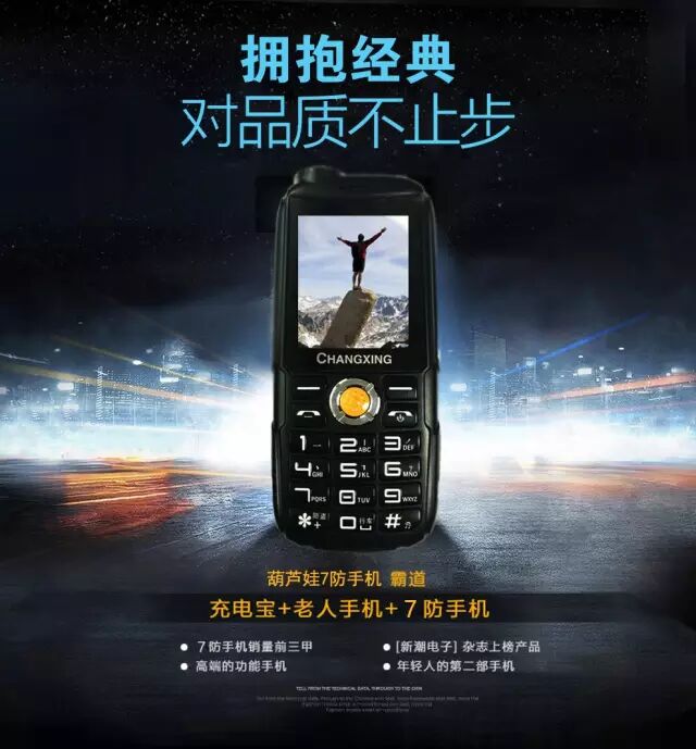 针对目前手机发展对老年人、手机发烧友以及驴友忽视的现象!本公司特别融合了葫芦娃的技能在此款手机中,推出“葫芦娃7防军工级”手机!同时也为致敬!