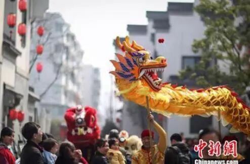 2015年农历二月初二,民间舞龙队在南京城南老街舞龙。