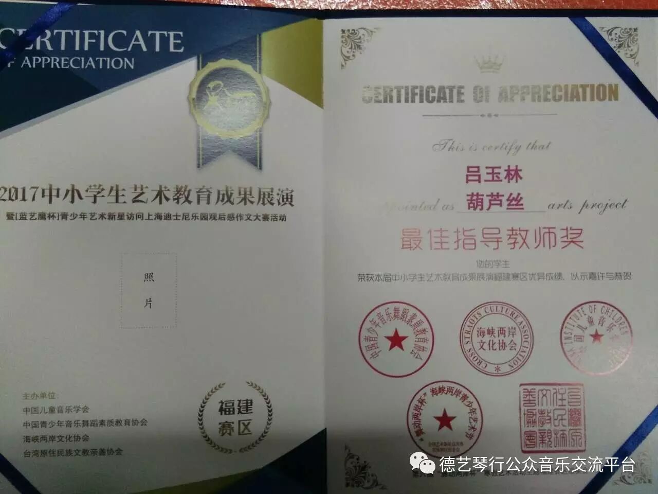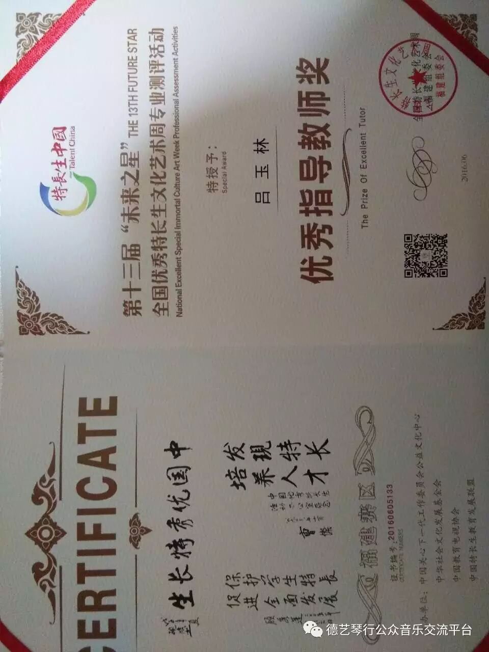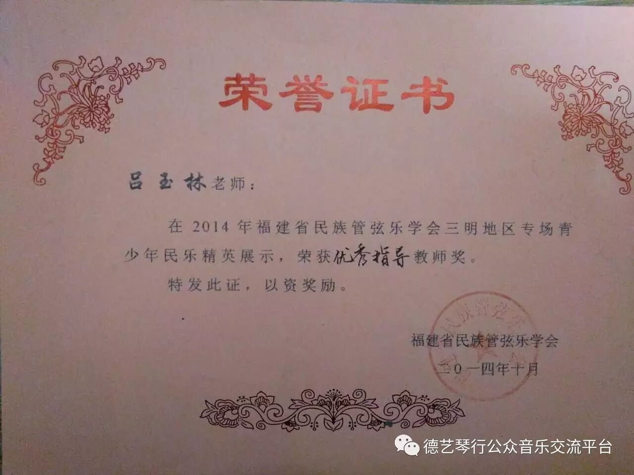 德艺琴行创始人吕玉林老师,自幼学习竹笛,毕业于三明学院艺术系,竹笛、葫芦丝专业,福建省三 明市民族管弦协会会员,同时也是福建省三明市音乐家协会会员,受过良好正规的音乐教育拥有较强的演奏水平和教学水平,曾在各比赛中多次获奖,其中在2012全国敦煌杯荣获“优秀演奏”奖;2013年福建省推新人大赛荣获竹笛青年组“金奖”;2014年福建省推新人大赛荣获“优秀教师指导金奖”;2016年荣获……优秀指导奖。