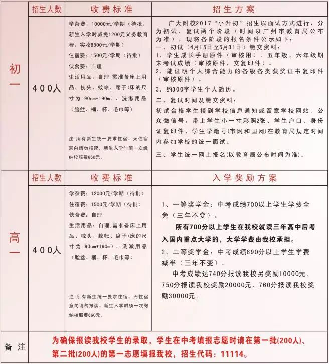 而在广大附校今年的入学奖励方案中,中考成绩700分以上的学生可获一等奖学金,学费全免(三年不变)。所有700分以上学生在校就读三年高中后考入重点大学的,大学学费由校方承担。中考成绩690分以上的学生二等奖学金,学费减半(三年不变)。中考成绩达740分报读奖励20000元、760分报读奖励30000元。