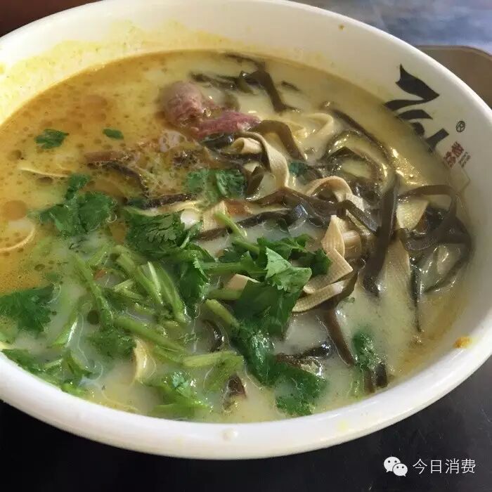 属于浓汤烩面,内有千张、海带丝、粉条和两片肉。。表面飘着一层油,里面有咖喱粉,所以汤看起来比较黄,味道不错,另外,他家的素鸡也很不错。