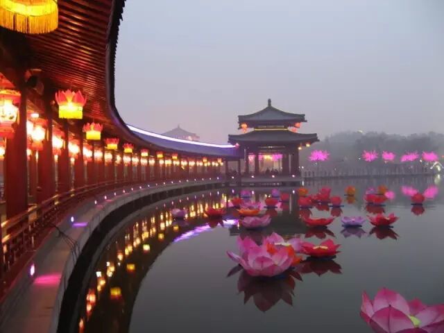 大唐芙蓉园:位于大雁塔东南侧的大唐芙蓉园,建于原唐代皇家芙蓉园遗址上。如今这里拥有国内最大的仿唐建筑群,来到这里,观赏恢弘的仿唐建筑,欣赏灯光衬托下的美景