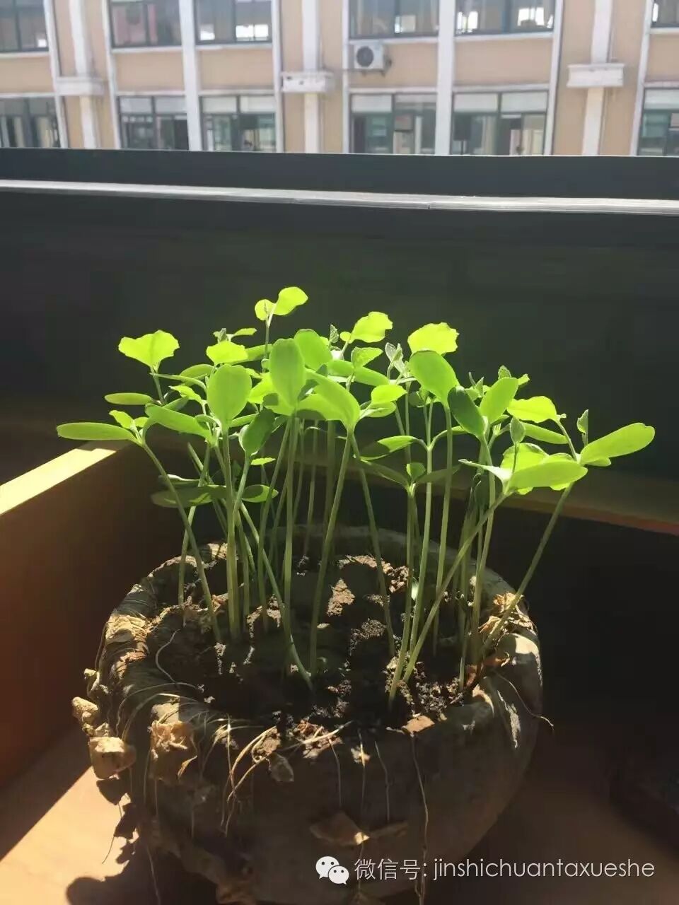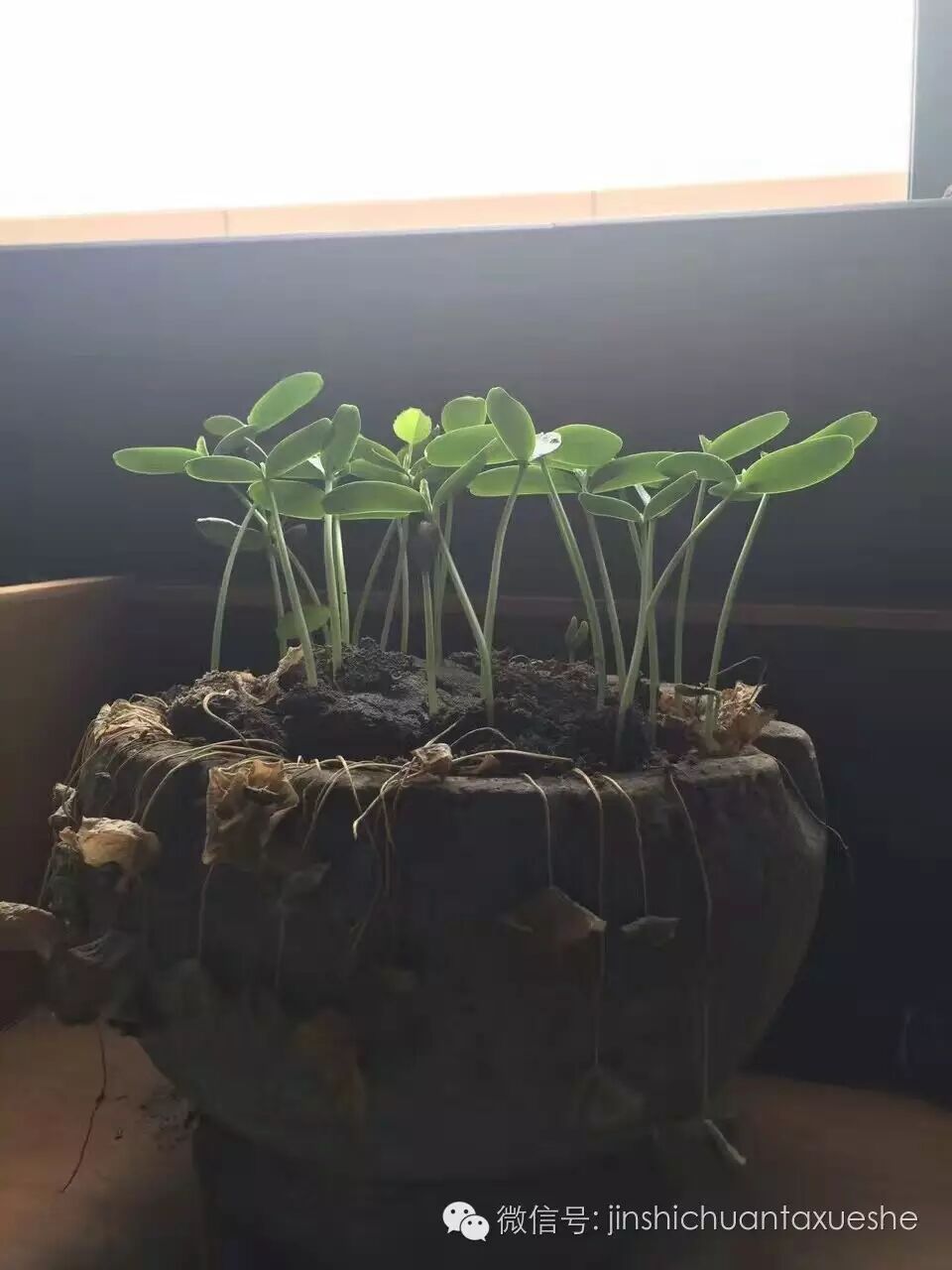晃荡的时候,自然里面的葫芦籽也都掉出来。没有什么刻意种。掉的地方正好是那个满是金钱草的石臼里。我一直种得很好的金钱草在暑假终于有点败落。有一天忽然钻出一片翠绿。一时间搞不清什么情况。