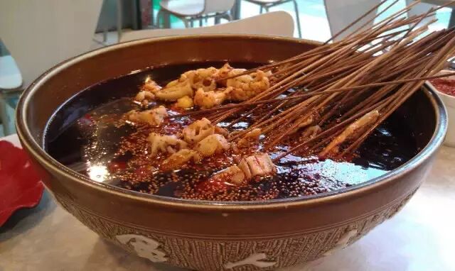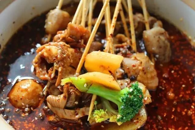 食材烫熟后串在竹签上,一把把浸泡在红油里,强迫症患者看了也神清气爽。
