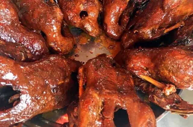 色泽红润金黄的表皮是用饴糖,蜂蜜,料酒,茴香,草果,甘草制作而成,卤熟的鸭子刷上蜜糖,棕红的表皮很酥,香气四溢。