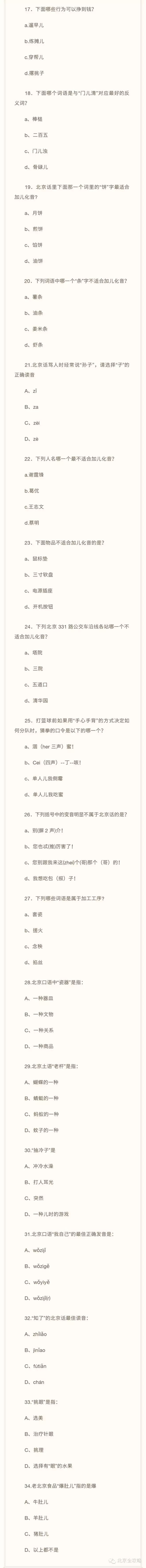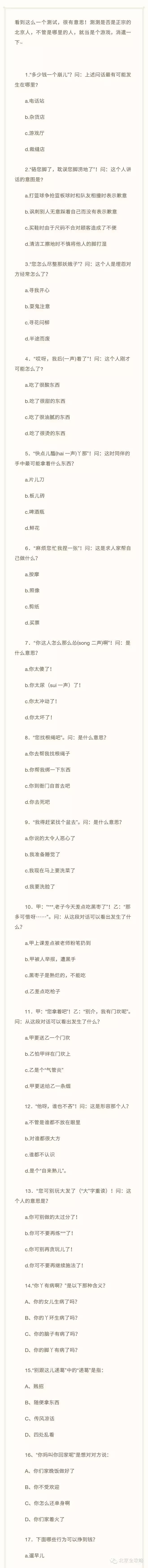 您是地道的老北京人吗?好吃的,好玩儿的,招笑逗乐儿的,都是属于北京人儿的……看看这26条,您都符合吗?最后的测试题大家有兴趣可以测一测~