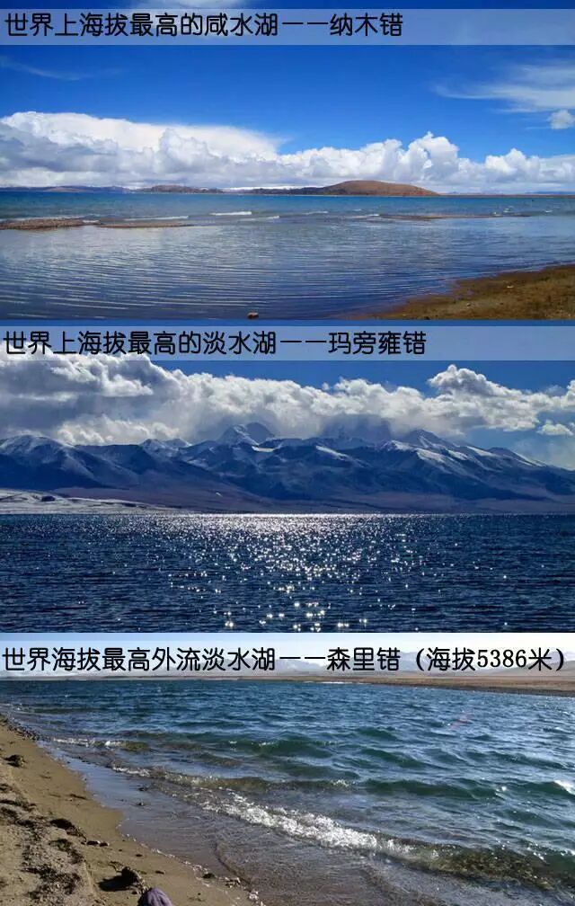 纳木错:纳木错位于西藏自治区中部,是西藏第二大湖泊,也是中国第三大的咸水湖。"纳木错"为藏语,蒙古语名称为"腾格里海",都是"天湖"之意。纳木错是西藏的"三大圣湖"之一。