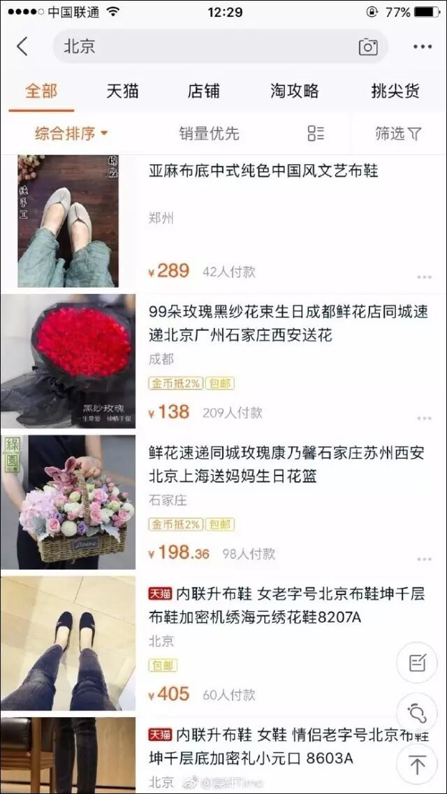 首先,搜索北京,排名靠前的是北京布鞋,由于布鞋的用料以布料为主,具有透气、舒适、轻便等特点,作为北京的特产之一,深受人们喜爱,可以理解。