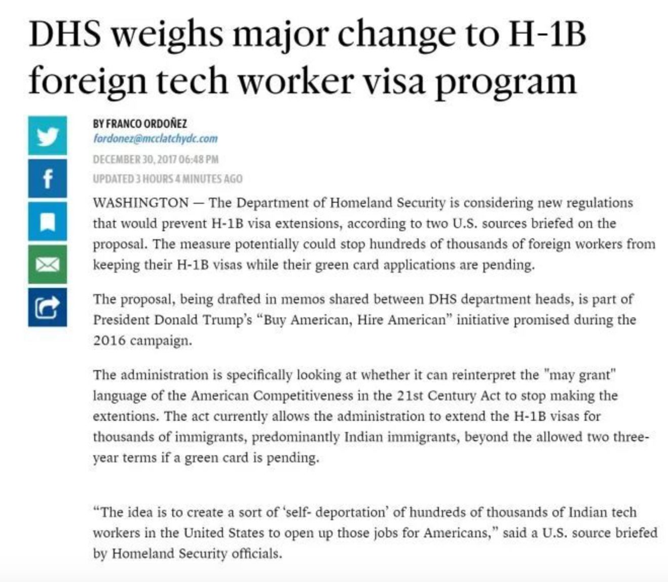 新年伊始,响应川普政府“用美国货,雇美国人”的口号,川普政府反移民有了新举措:将不再允许拿h1b超过六年,但已经申报绿卡(提交140表)等待排期的人留在美国继续工作。