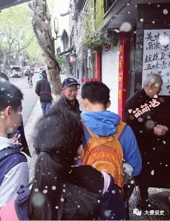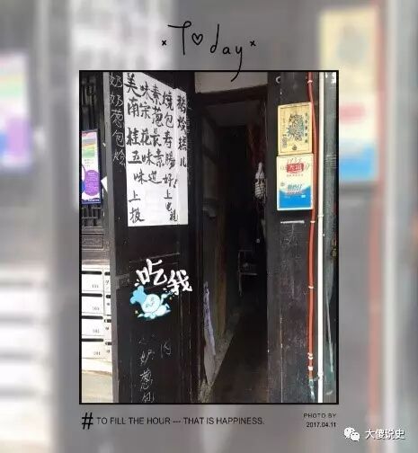 正当我们陶醉在这诗样的意境中时,从马路对面手舞足蹈地闯过来一位老爷子,老爷子一把拦下乖乖走路的小羊,指着旁边的一扇门,叽里咕噜地说着我们谁也听不懂的火星话,只见那破旧的木门上贴着张类似“广告”的东西,用还算看得懂的大字写道:“美味素烧鹅,南宋葱包烩,桂花长寿糕,五味素肠儿,味道好!上报上电视”。门上还有个招牌“孙奶奶葱包烩”,看来是家小吃店,可……门里只有一条一人宽的过道,黑洞洞的望不到尽头,要说是鬼屋,信的人会更多一些吧?看来是这老爷子的黑风洞。