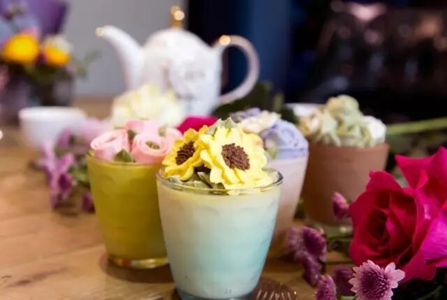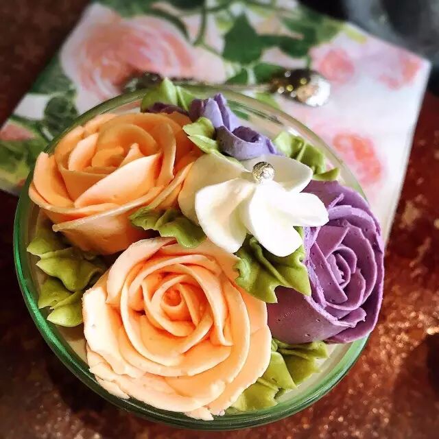 惹人爱的鲜花不仅好看还好吃!店里请韩国甜品师结合花艺设计,慕斯杯上层是用动物奶油制成的韩式裱花,纯进口的原材料让口感也变得香甜馥郁。