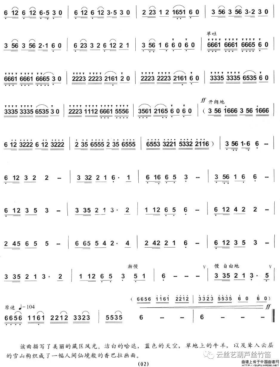 该曲描写了美丽的藏区风光,洁白的哈达,蓝色的天空,草地上的牛羊,以及耸入云层的雪山构织成了一幅人间仙境般的香巴拉画面