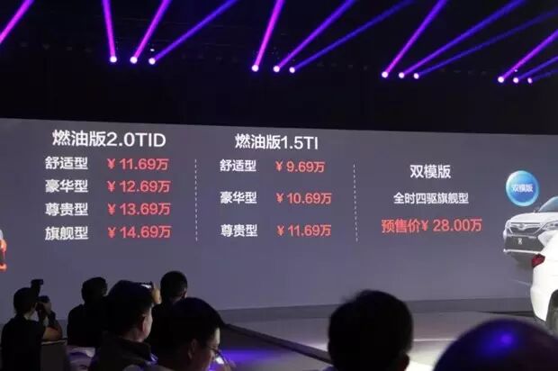 此次发布的宋共有7款车型,其中1.5TID有三款,2.0TID有四款,而插电版本车型则只有一款旗舰版(未上市)。从价格区间来看,舒适、豪华、尊贵三款1.5TID车型分别为9.69万、10.69万、11.69万元;对应的三款2.0TID车型分别为11.69万、12.69万、13.69万元,此外2.0TID还有一台售价为14.69万元的旗舰版。插电版本车型此次并未公布正式售价,但预售价已经达到了28万元,着实令人咋舌。所以从价格结构来看,燃油版车型将会成为宋的核心产品,插电式混合动力车型更多的是象征意义。