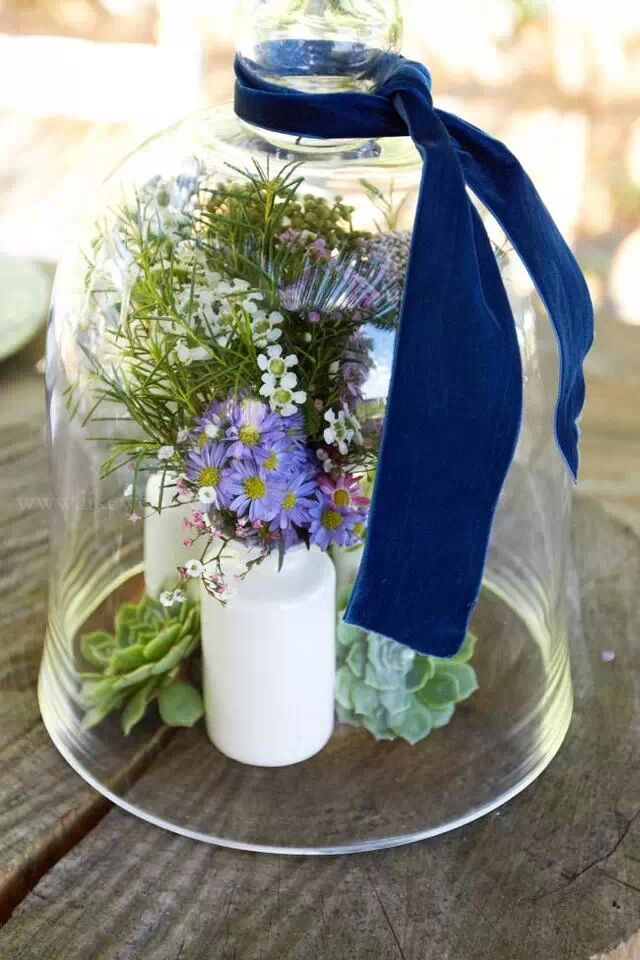 DIY沙滩婚礼中心桌饰。DIY小贴士:材料——圆柱蜡烛、多肉植物(最好是石莲属的)和自选野花(迷迭香、蜡花、补血草花、稻花、婆婆纳)。将上述材料在一个大玻璃钟形罩里布置好,再在玻璃罩顶端系上一条缎带或蕾丝。