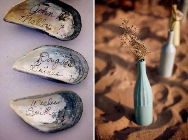 用牡蛎壳为宾客打造独具一格的座位卡。DIY小贴士:用黑色马克笔在清洁牡蛎壳的内表面写上宾客姓名。