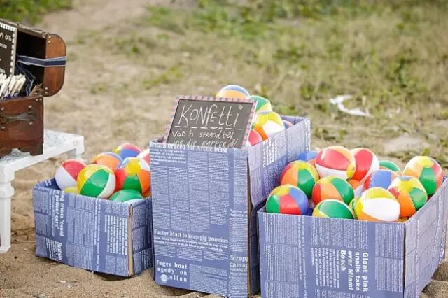 DIY婚礼抛球。在沙滩上,用抛彩球代替五彩纸屑吧!DIY小贴士:按婚礼色调买好充气沙滩球,在小黑板写上简介,招徕宾客们一起玩。沙滩球既可放在大柳条筐里,也能放在装饰好的纸箱子里。