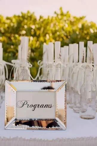 凸显独创性的海星形婚礼流程单,还能作扇子用。DIY小贴士:先根据海星的形状作好婚礼流程单的布局,然后按这种布局把相应内容印在卡纸上,再裁剪成海星状。最后再把海星卡纸固定在小木棍(冰糕或冰棍儿上用的那种)上,就做好啦!也可以把两张海星卡纸包着木棍背对背粘在一起,这样就可以在两面都印上婚礼流程内容了。