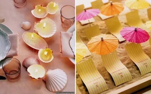 再来些海洋风串饰如何?用海星、贝壳、珍珠打造醒目的沙滩桌饰。DIY小贴士:用干净的钓鱼线或类似材料把海星和贝壳串成一串,固定好,不管是装饰婚礼餐桌和婚礼拱门都很棒。