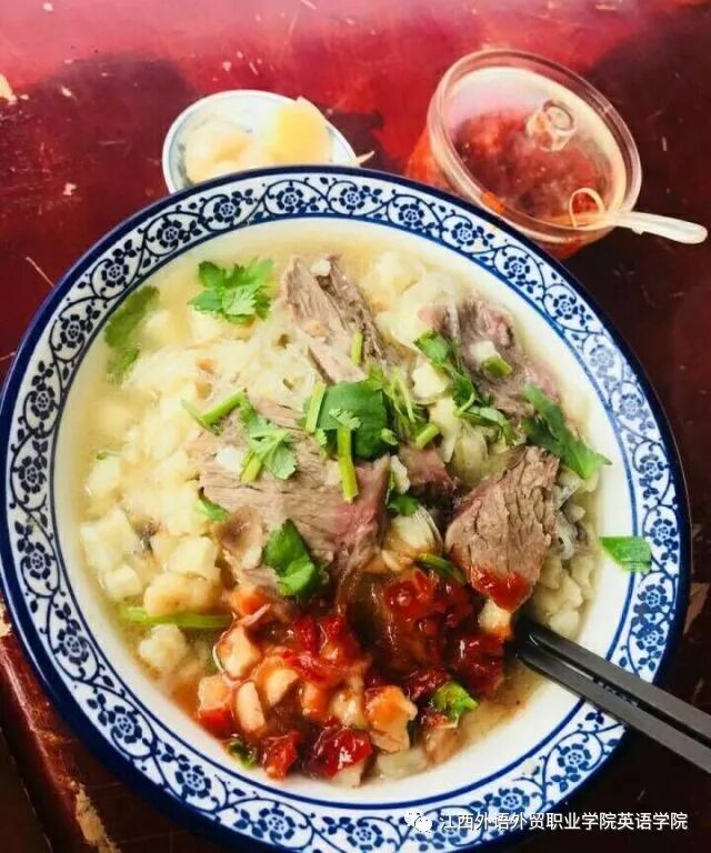 牛羊肉泡馍古称“羊羹“,宋代词人苏轼就留有"陇馔有熊腊,秦烹唯羊羹"的诗句。它烹制精细,料重味醇,肉烂汤浓,肥而不腻,营养丰富,香气四溢,诱人食欲,食后回味无穷。吃泡馍要蘸辣椒酱以及腌的糖蒜,当然这个辣椒酱以及腌的糖蒜的吃法也是有讲究的,刚开始吃的时候先直接吃泡馍,等感觉腻的时候,就一口糖蒜或者蘸点辣椒酱,吃几口后喝点清汤那真是极美的!