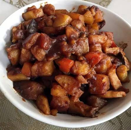 4、尝下土豆熟了没有,加盐,老抽和几块冰糖调味翻炒,收汁浓稠即可出锅