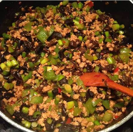 3、再起锅放底油烧热,放豆瓣酱翻炒出油,依次放青椒、蒜薹翻炒,加黑木耳翻炒,最后将炒好的肉糜放入一起翻炒,点少许老抽调色,加糖放鸡精后试味,淡的话放生抽。