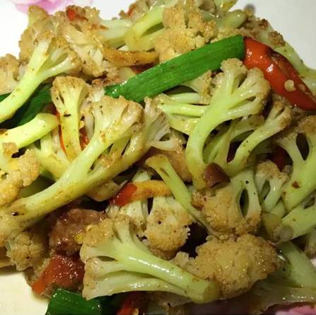 7、放入菜花,大火炒至菜花变软,约3,4分钟左右,