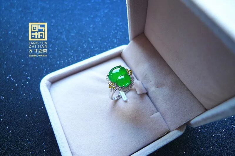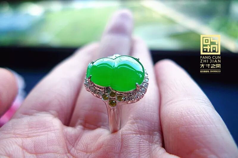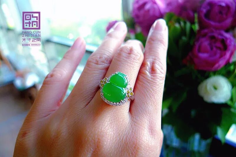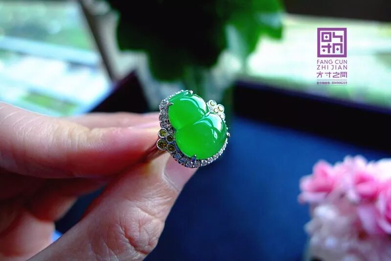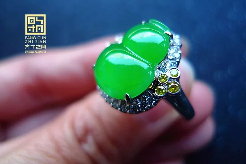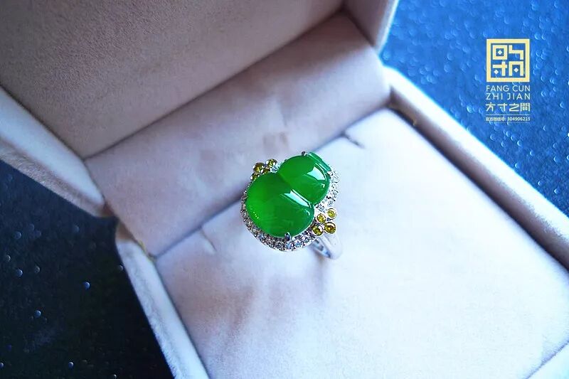 高冰起光艳阳绿翡翠葫芦戒指:老坑种, 强胶感,化地无颗粒感, 起莹光, 结构紧密到起猫眼。色力奔放, 艳阳浓翠, 色正而满, 不挑光线。器形端正, 无纹无裂, 右侧有道小棉线,打灯可见是一小片极细的棉, 图片有特写。精工镶嵌,黄白双色火彩美钻相伴, 款式经典大气, 适合任何手型,永不落伍。裸石:13.5*10.5*3.5MM, 圈口:13#