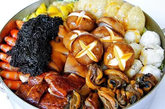盆菜,这种源于元朗围村的传统菜式,一盆菜里可荟萃有百菜百味,共冶一炉,基本原则是“和味”。过去,农村里有喜庆事,便在空旷的地方,配以木台木凳,以木炭加热,大家围着热烘烘的盆菜,一边品尝,一边庆祝。人们喜欢逢年过节时吃盆菜,盆菜就有了喜庆团聚的意义。