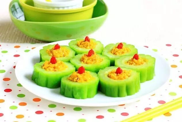 酿苦瓜与酿豆腐、酿茄子、被称为“煎酿三宝”;清蒸而出的酿苦瓜咸鲜脆嫩,清淡爽口,苦瓜香气诱人,微苦鲜香,不但有清热解毒、明目败火、开胃消食之效,还因为它是蒸菜,吃了可以暖胃益气。