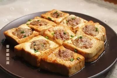 客家酿豆腐也称为肉末酿豆腐、东江酿豆腐,是客家名菜之一,据说与北方的饺子有关。通常将油炸豆腐或白豆腐切成小块,,用香菇、碎肉、葱蒜等佐料填补进去,然后用砂锅小火长时间煮,食时再配味精、胡椒等调料即可。