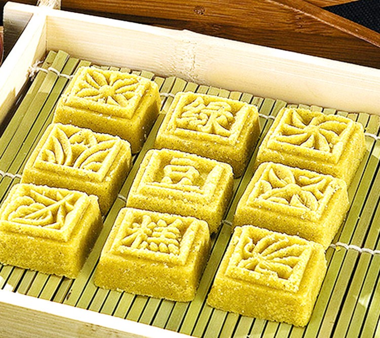 桂花糕已有三百多年历史。相传,在明朝末年,新都县城有个叫l刘吉祥的小贩,从状元杨升庵桂子飘香的书斋中得到启示,将鲜桂花收集起来,挤去苦水,用蜜糖浸渍,并与蒸熟米粉、糯米粉、熟油、提糖拌合,装盒成型出售,取名桂花糕。