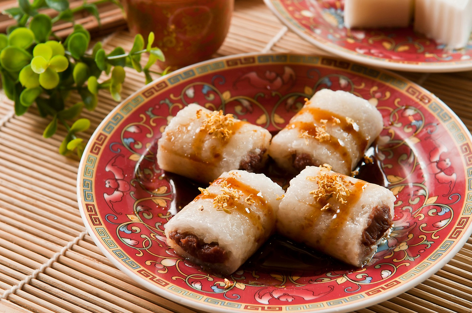 8.将作法6糯米饭向同一方向捲起成圆柱形,再用塑料袋捲起覆盖住,再放入冰箱冷藏1-2小时后取出切成每个3-4公分长的圆柱形,移入盘9.中最后淋上作法4的桂花糖蜜即可