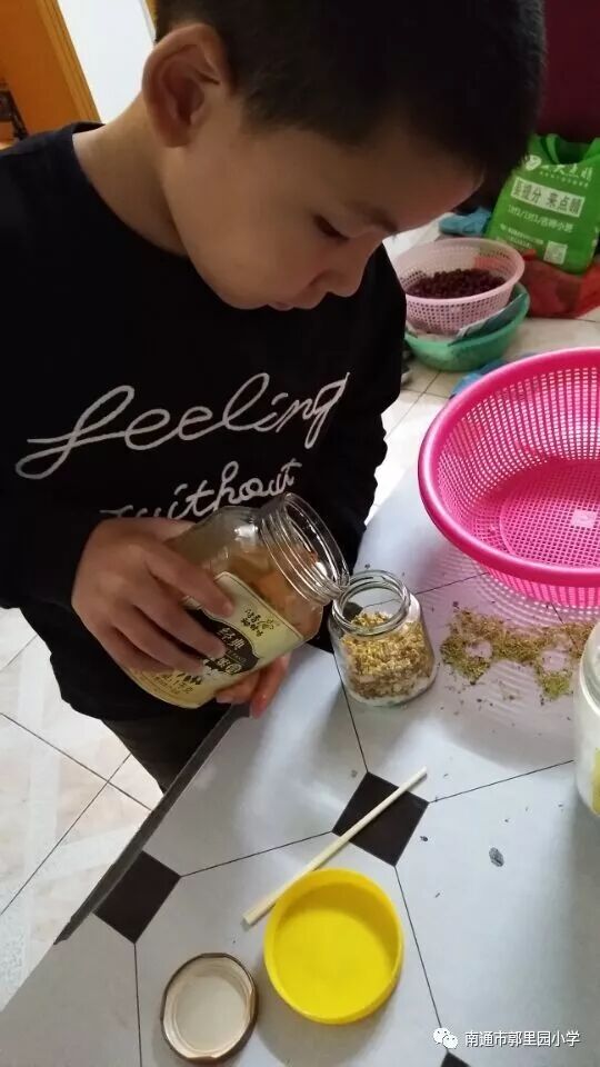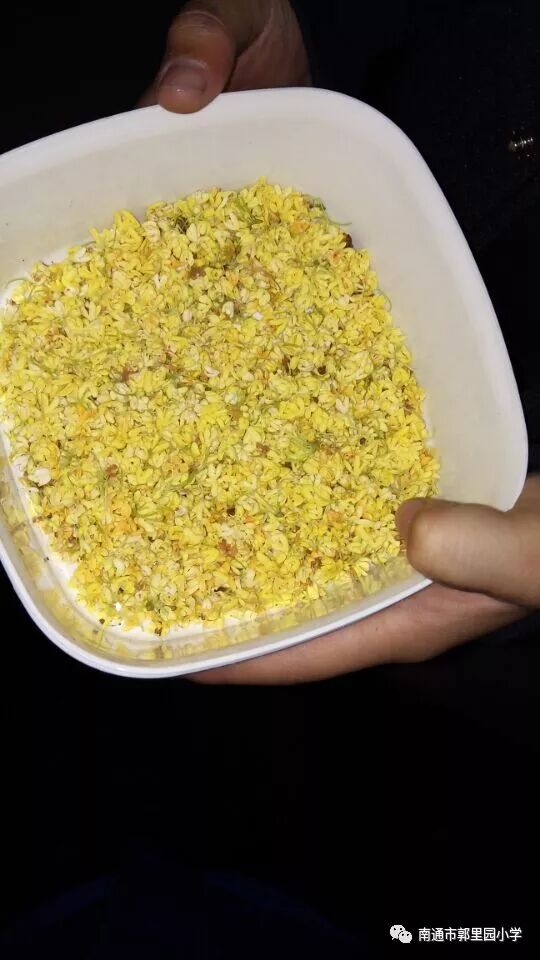 周末,孩子们就采摘了新鲜的桂花,洗净晒干,装进干净的容器备用。周一,孩子们将准备好的桂花和白砂糖一起带到学校,还特地准备了一个密封的干净容器,用来盛放桂花蜜。