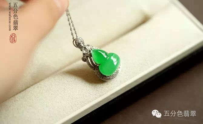 冰种,艳绿,这样的好种好色必然要拿下的。和商家一翻斗争,她年前想出货回收资金,可我出价太低,纠结着不愿意给,费了无数唇舌最终还是给了我,不过要把葫芦上带的金链子拿下来。汗,可见她真是没什么利润,连几百块的链子也要要回(做中档货的玉商身家其实不低,在意这几百块实属无奈)。有时候收货,从商家的一些表现也可以知道是拿贵还是便宜了。这个便宜,也顺延给店里一直支持五分色的色友们,好色的MM可以看看啦。