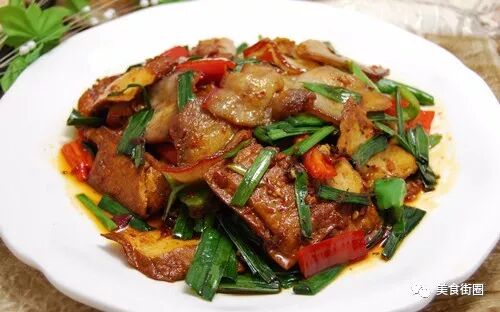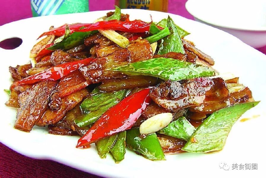 本菜出锅装盘,可见肉片肥瘦相连,金黄亮油,蒜苗清白分明,虽熟仍秀。下面图片的菜品,就是一盘失败的回锅肉。其他所谓“连山回锅肉,青椒回锅肉、锅盔回锅肉”等,均系派生出来的新派川菜,相比正宗老派的回锅肉,虽是枝枝独秀,却已不可同日而语了。