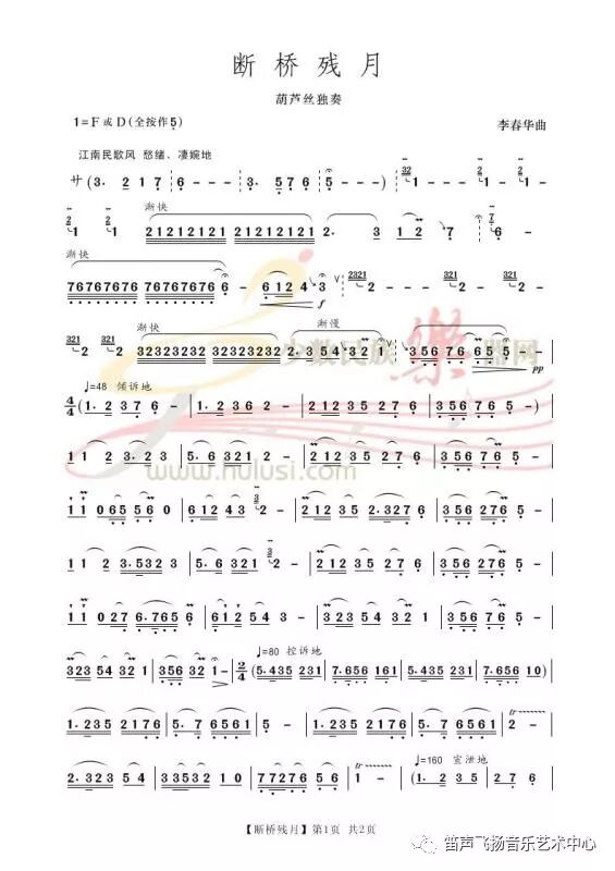 《断桥残月》是我国葫芦丝青年演奏家李春华创作的一首独奏曲,曲子的前后两段是凄切悲凉的咏叹调,如泣如诉,透人心脾,中间一段快吐犹如疾风暴雨呼天唤地,充分表达出曲中主人公满腔的惆怅和愤懑,构成了一副夺人魂魄的音画绝响。