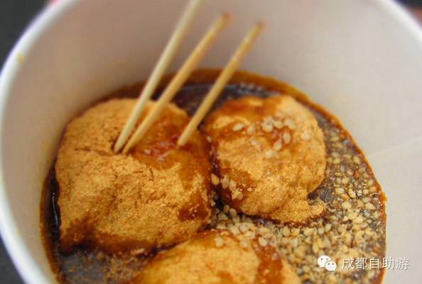 蛋烘糕是成都走街串巷、现烘现卖的名小吃,香喷喷、金灿灿的,刚开始,蛋烘糕只有芝麻白糖,芽菜,大头菜和牛肉这些普通的口味,后来沙拉、肉松、奶油、果酱等新口味也出现了。