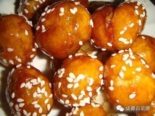 制作方法:将糯米加大米淘洗干净,用清水浸泡约10小时,然后去水,用磨推后装口袋中榨干水分,再用少许清水,用粉渗水,用手揉匀,搓成圆团;将菜油入锅,烧过后下红糖,待油烧沸,糖全部溶化后,即将粉团入锅炸,同时不断翻 ,炸成黄褐色起锅,放于芝麻簸箕中,使糖油果子不粘上芝麻即可。