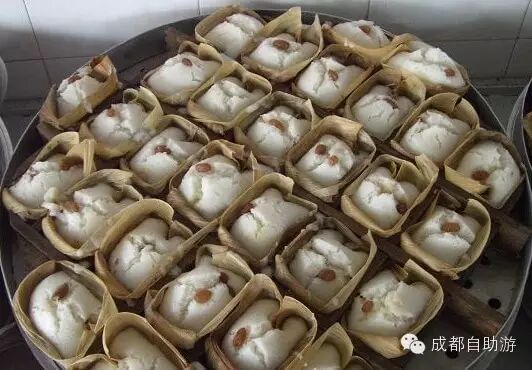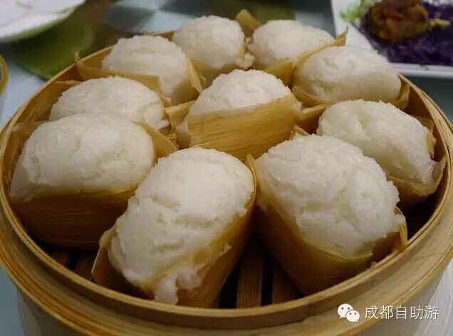 制作方法:锅中放油烧至五成熟,放入肉粒煸炒后放入碎米芽菜炒匀,装在碗里待用;在糯米粉里加水揉成团,把叶子剪成段;取适量面团在手里捏成碗状,放进适量馅料,搓成圆球后放在叶子上;沸水蒸几分钟后取出即可。