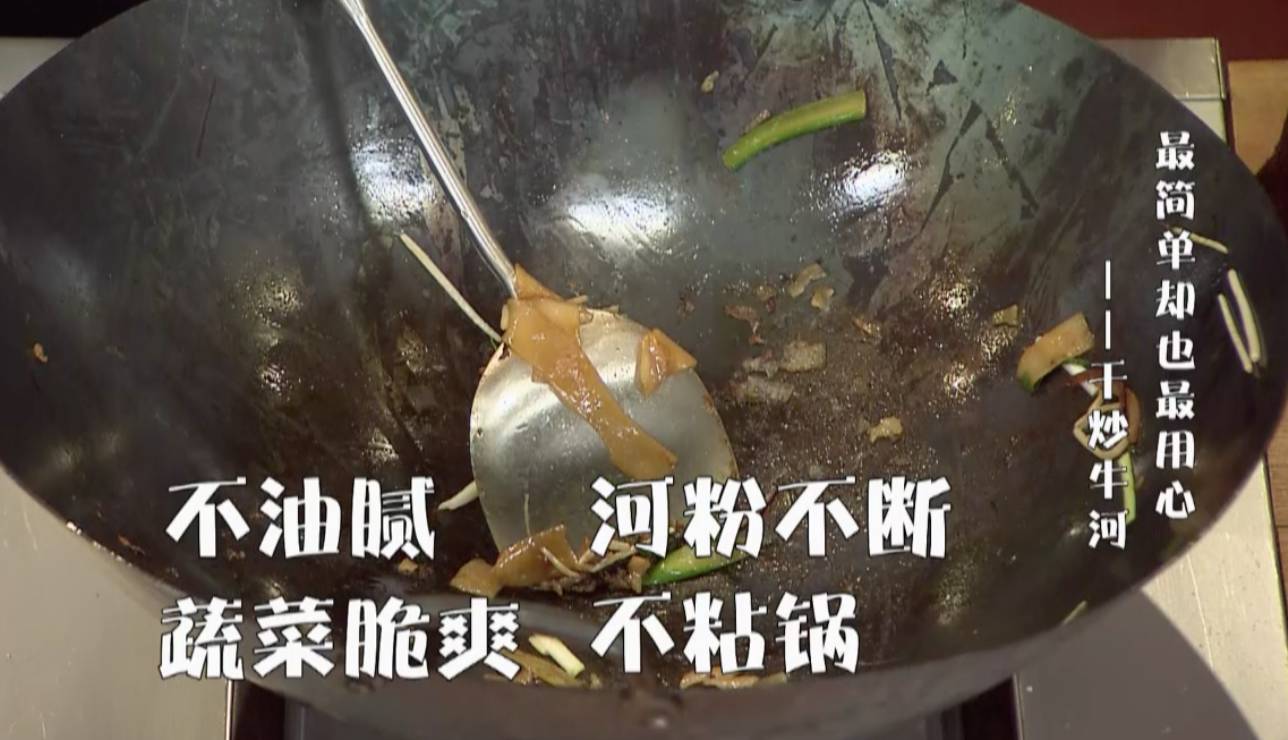 麻大厨说了,这干炒牛河虽然食材非常简单,但做法很考技术!必须猛火快炒,控制油量!有四项标准可以检测干炒牛河地道与否,您记好了:“不油腻!河粉不断!蔬菜脆爽!不粘锅!“