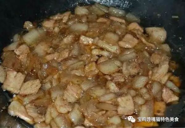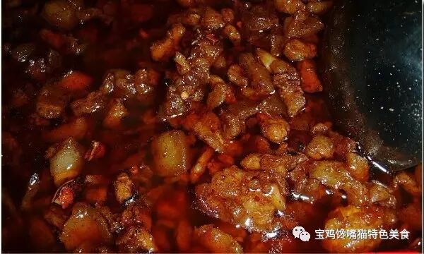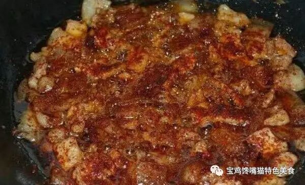 4,待肉熟后,揭开锅盖在肉上均匀撒上辣椒粉,这个过程不要翻动,让油自然浸透辣椒粉后,翻炒下就可以出锅了。一锅香喷喷的岐山臊子做好了。