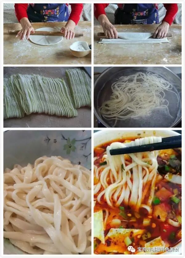 正宗的岐山臊子面都是用手擀面,要擀得非常薄,再用大刀切细,面条煮出来半透明状,又劲道又光滑,这就是人们常说的"薄,劲,光"。不过在家里也可以用机器面条代替手工面。要用新鲜面条,条件有限的干挂面也可以,只是口感没新鲜面条那么好。然后把面条在开水里煮熟,煮面条一定要水多。煮好的面条捞出来先用冷水过凉再回面汤锅里烫热放入碗里撒上蒜苗再浇上做好的臊子汤,记得面要少,汤要多。一碗正宗的岐山臊子面大功告成。