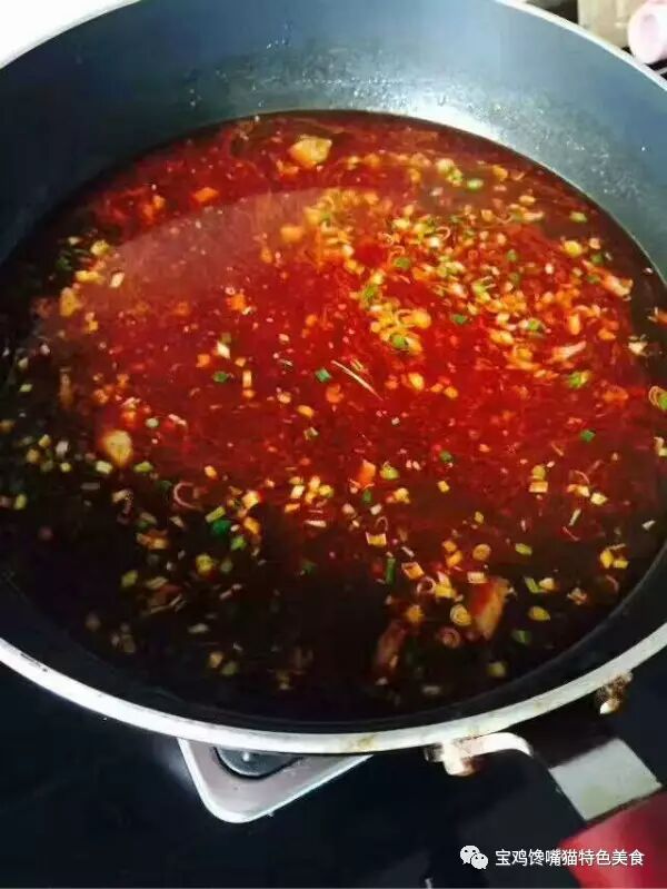 锅里多一些油烧热后加姜末,辣椒面,五香粉,炒出香味,倒醋,醋要多一点待锅中醋沸腾后加入肉汤,也可用开水代替。汤里放入肉臊子,盐,鸡精调味,再放入底菜,漂菜,蒜苗先不要放,调好的汤味道要求酸辣爽口。