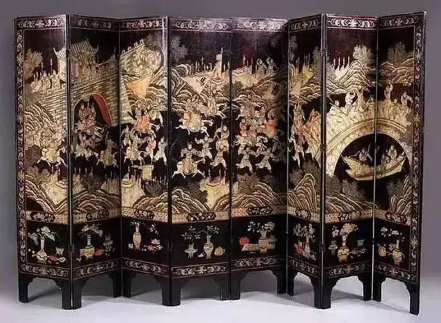 而不同工艺制作的屏风各有千秋,玉石镶嵌类层次清晰,玲珑剔透;金漆彩绘类色彩艳丽,灿如锦绣;雕填戗金类线条流畅,富丽堂皇;刻灰润彩类刀锋犀利,气韵浑厚。