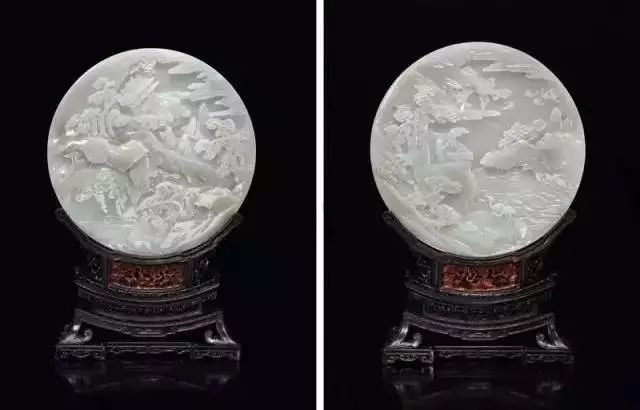 青白玉雕仙人祝寿纹圆插屏