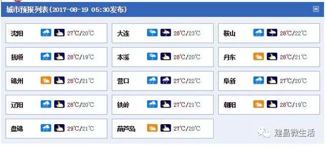 全省天气预报:19日早晨辽中、新民、康平、台安、彰武、大洼、建昌有浓雾,19日白天到夜间沈阳、大连、鞍山、抚顺、本溪、丹东、锦州、营口、辽阳、铁岭、盘锦地区及喀左、凌源、建昌阵雨或雷阵雨转多云,上述地区伴有短时强降水、雷暴大风、冰雹等强对流天气,阜新地区及朝阳市区、建平、北票、葫芦岛市区、兴城、绥中多云,全省最高气温27度到29度。20日白天到夜间全省多云。21日白天到夜间朝阳地区阵雨或雷阵雨,其他地区多云有时晴。
