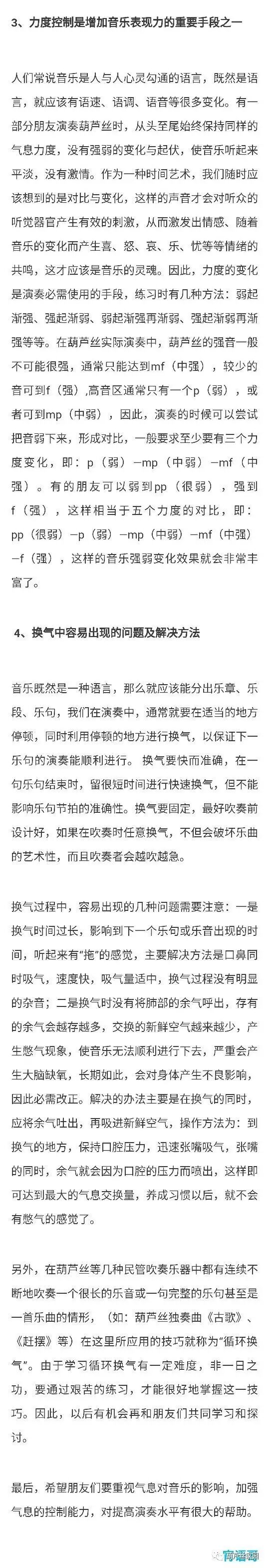 基础练习(基本功)主要包含气、指、舌这三方面。其中,指的基本功练习往往容易被初学葫芦丝的朋友们接受,如:很多初学者能主动练习各种葫芦丝教材中的各类活指练习曲。其次是对舌的练习。如:各类单吐、双吐以及三吐的练习。但是,大多数初学者往往忽略对气息的基本练习。然而我认为气息的正确使用恰是提高葫芦丝演奏水平的重中之重。下面,就如何正确的气息应用与葫芦丝演奏技巧的提高谈一下自己的认识和看法,望朋友们共同探讨。