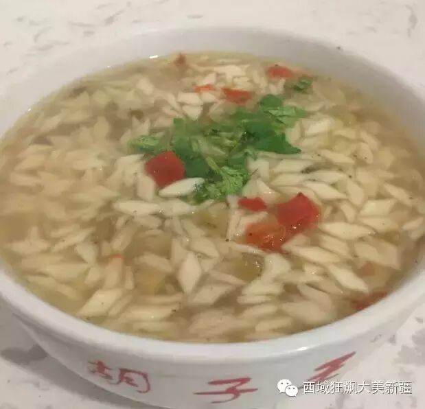 面旗子算是老新疆饭了,多数老新疆人都会做,老人都叫它“雀舌儿饭”,因面片形状精致小巧,好似麻雀的舌头。半个世纪以前,穷苦人家缺少食物,就拿一小把面,揉好擀成薄薄的面皮,用菜刀切成细小菱形的薄片,放进开水锅里,撒点盐,再放一些葱花和扁豆,煮熟后就汤而吃,它是一种家庭的主食。 随着生活水平的提高,扁豆面旗子慢慢的退出了人们的视线。