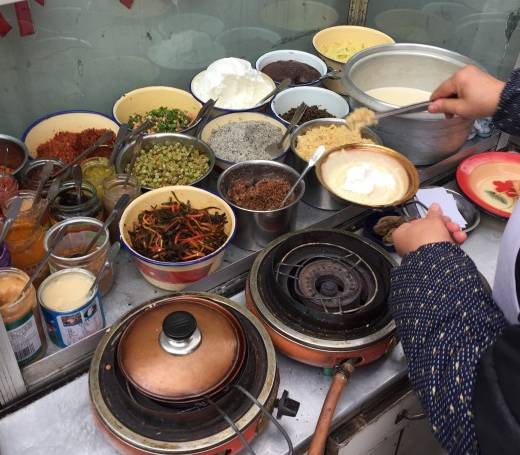 这家饼皮薄而脆,边边很香,馅儿也很丰富,三丝、青椒火腿啦,土豆丝啦,肉松、奶油、蓝莓酱等等等等,特别的多。味道也非常棒!